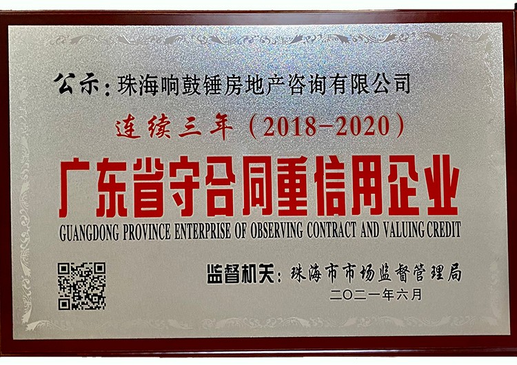 人无诚信不立,家无诚信不和,业无诚信不兴,国无诚信不宁。为弘扬企业诚实守信的风尚,营造诚信的市场环境,珠海响鼓锤房地产咨询有限公司凭借良好的社会信誉和规范的信用体系荣获广东省“守合同重信用”;企业的表彰,公司已经是连续3年获得此殊荣。