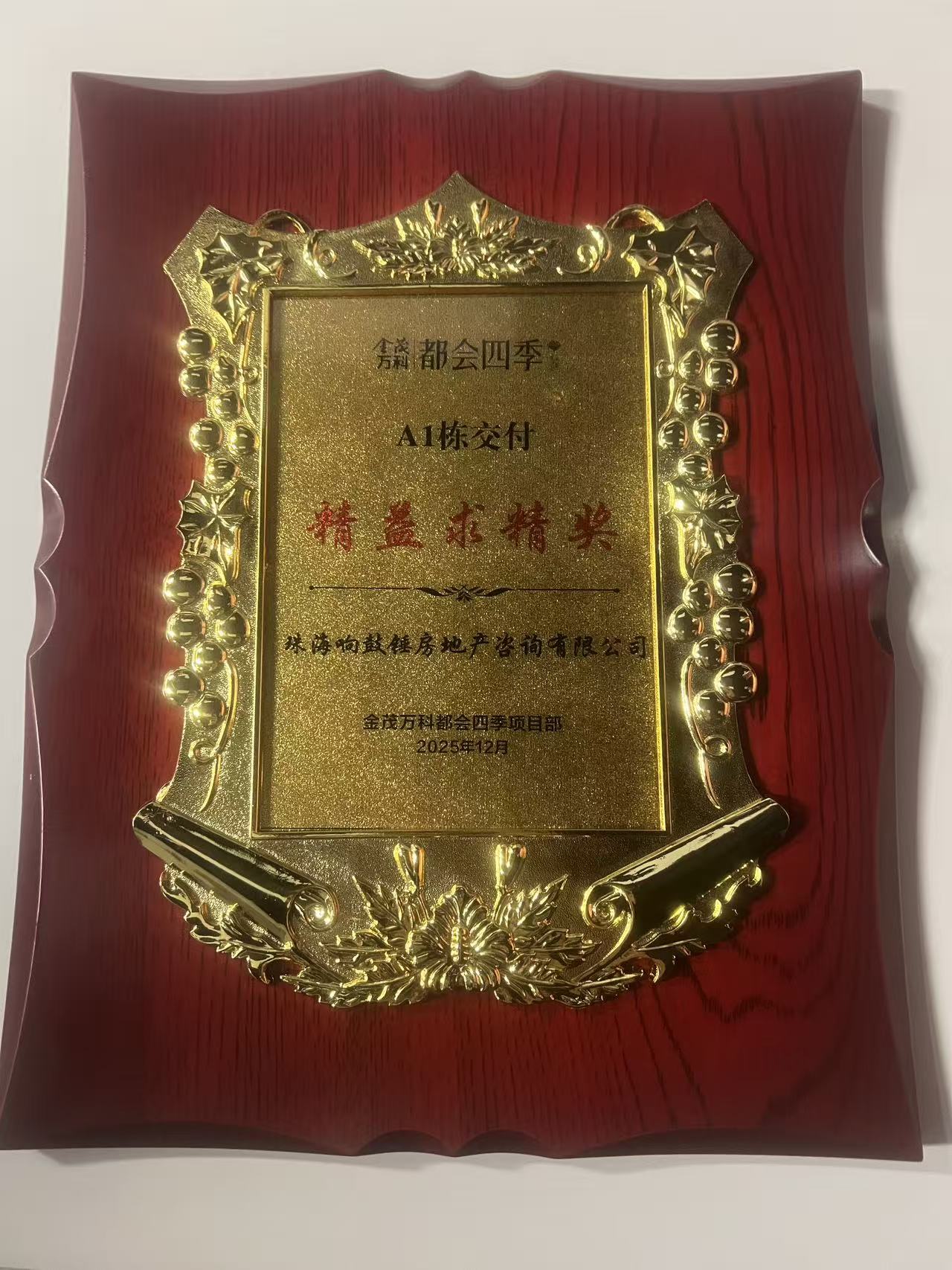 2026年1月,珠海响鼓锤房地产咨询有限公司广州金茂万科都会四季项目团队,收到了来自项目方的两份荣誉——“细节制胜奖”奖杯与“精益求精奖”奖牌。这份肯定,既是鼓励,更是我们继续前行的动力。