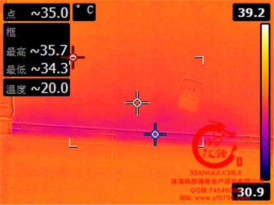 这类问题最严重的后果就是直接影响了房檐滴水线(鹰嘴处)。如设计不合理,雨水容易沿房檐处下走流至钢筋外露处浸入窗框发生渗漏现象。那么,究竟这样的问题会不会造成渗漏,渗漏的结果又如何呢?我们先看看红外线照片。