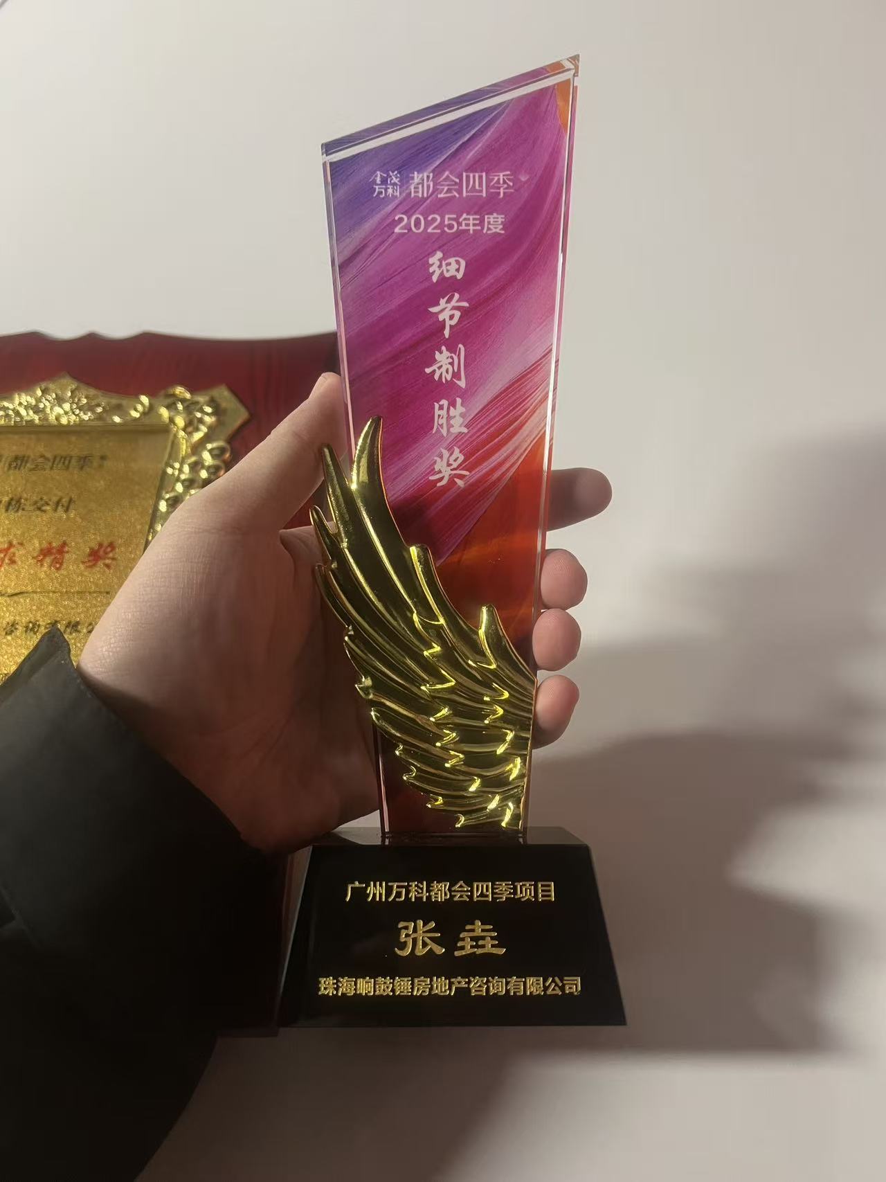 2026年1月,珠海响鼓锤房地产咨询有限公司广州金茂万科都会四季项目团队,收到了来自项目方的两份荣誉——“细节制胜奖”奖杯与“精益求精奖”奖牌。这份肯定,既是鼓励,更是我们继续前行的动力。